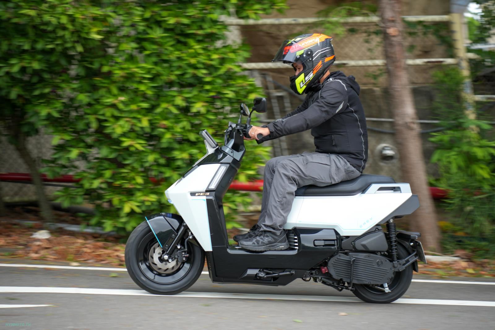 一般充電式的電動車多數適合在獨棟房子來做充電使用,不然就是要將電池拆下又辛辛苦苦提到室內來充電,而換電式的電動機車除了要面對每個月的月租費外還要擔心能不能換到滿電的電池,這也是目前電動機車都會遇到的問題,而 PE3 的概念是保留充電孔但不走換電的形式,主電池是與中油開發的新型態新型態軟碳鋰三元電池具備高能量密度、超低電阻與超長壽命等特性,PE3 的動力電機輸出功率大概在 4kW 等同是綠牌等級最大時速約在 72km/h 上下,在電量低於指定比例時將會由 VCU 控制電腦來啟動引擎,引擎啟動後會帶動發電機開始為電池充電並在電腦的控制下實現正回充,避免越騎越沒電、燃油全浪費的情況產生。