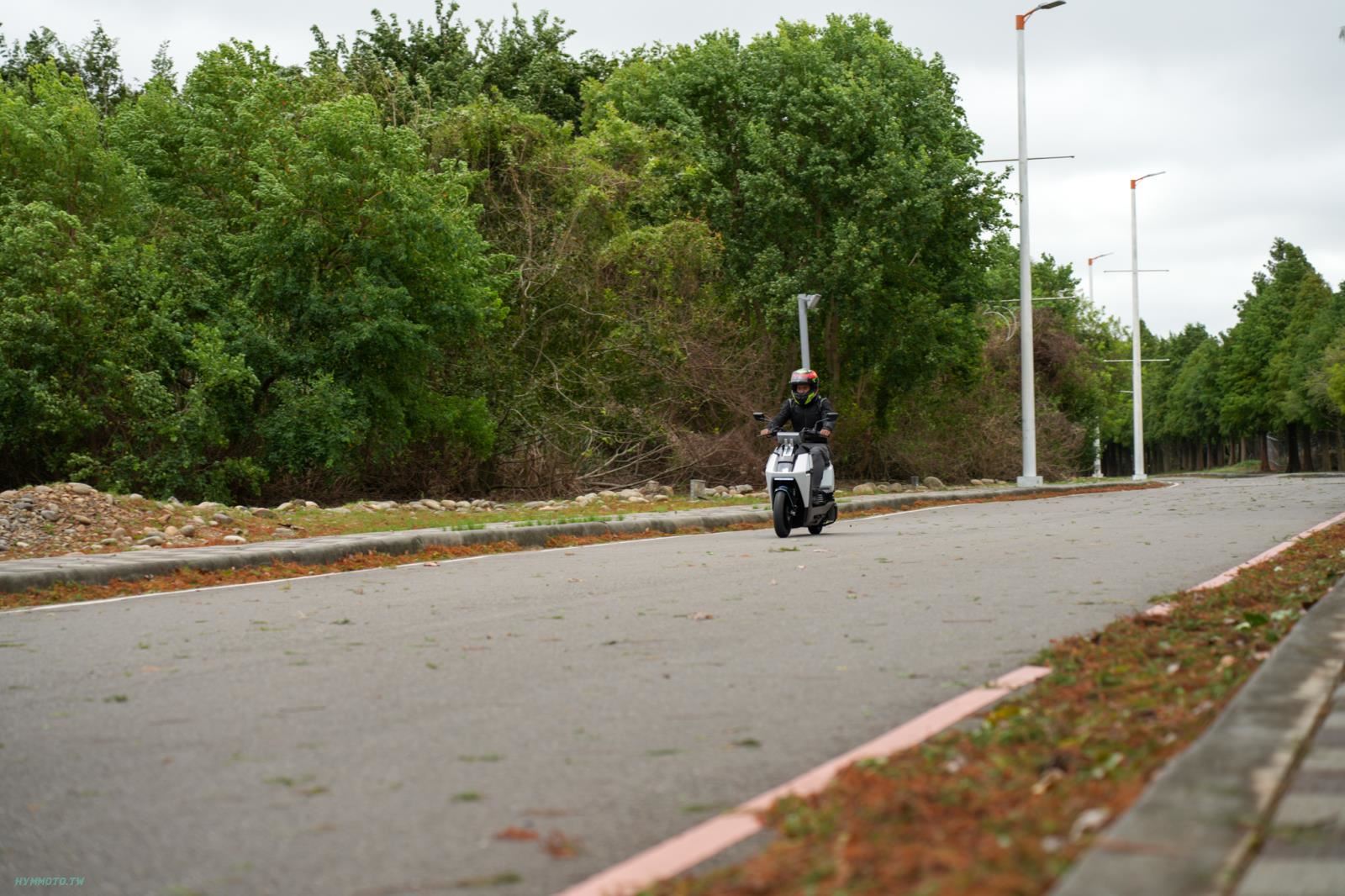 當天的特調模式還有模擬低電量時讓引擎發動開始幫電池進行充電,雖說使用 Woo115 的引擎系統但整體的感受在發動的部分,使用 Z.R.S.G. 的無刷啟動系統在引擎發動時不會感受到太大的震動感,而在試乘當天剛好颱風外圍環流經過所以台中麗寶所在地后里也有陣風的出現,騎乘當下該如何知道剛剛引擎有啟動呢?說起來很妙在風聲的影響下啟動聲音直接被掩蓋,多數專注在閃避路上大面積落葉的我也感受不到引擎作動的震動,僅有引擎回充關閉時因為 Z.R.S.G. 系統在熄火後會將活塞轉到下死點的因素,將活塞復歸到該點時才會有比較明顯的震動,這點就跟三陽有 Z.R.S.G. 系統的燃油車輛一樣。