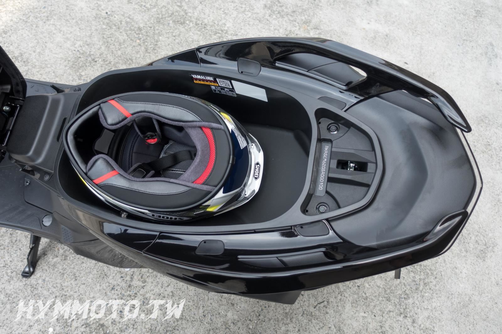 既然說到坐墊底版變得更加平整那安全帽的放置就必需倒著來放,能夠容納 SHOEI X-15 XL 大帽體的關鍵就是在車廂底部的圓弧凹槽再度放大且變得更深,同時車廂後方還有足夠的容量來放置雨衣或騎士個人小物。