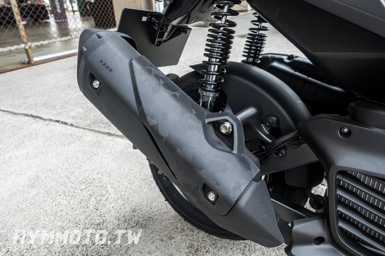 有別於上六代勁戰在排氣管防燙蓋上做出較多的線條來搭配,CYGNUS-X 則是維持減法設計讓防燙蓋造型變得較為平實,後續藉由模具上的紋路來打造出迷彩般的不規則花紋,讓防燙蓋的花紋也能與車頭兩側花紋來相互對應。